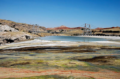 Immediately after leaving the canyon with it’s gray-colored walls, the rock ledges on the hills before us were a bright red-orange. The rock changed colors again as we came through Thermopolis, WY. Thermopolis is home to the world’s largest hot springs. The hot springs, like those in Yellowstone, have multicolored rock all around. The difference here is the fact that the pools of the springs is very large. They even have a suspension bridge built over one of the pools for pedestrian traffic.